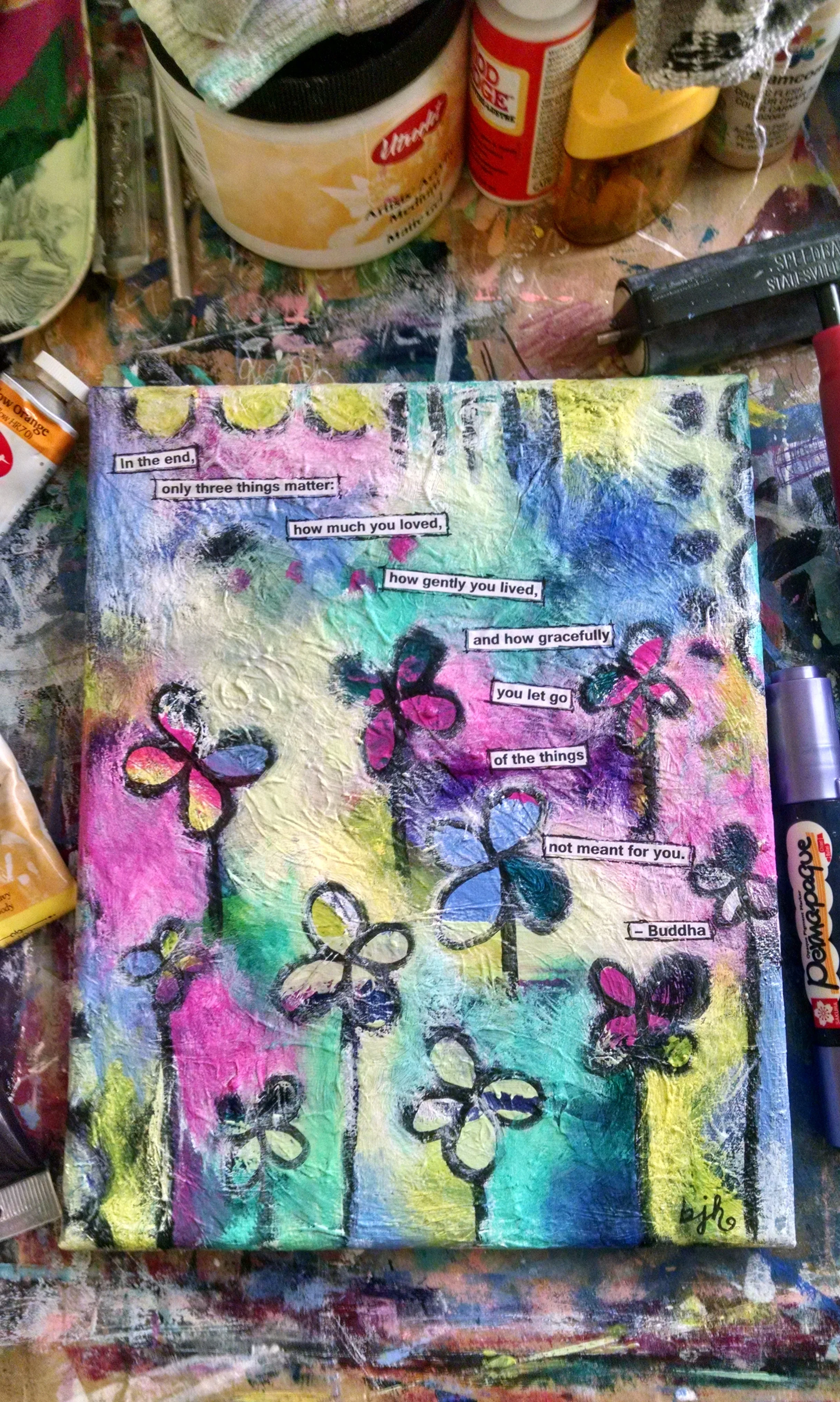 I’m also a writer who loves symbolism and word magic, which means that I’m all about layers, literally and metaphorically. Layers of color, layers of media, layers of meaning. I’m enamored of many different kinds of media and styles, and experimenting with both, and my art reflects that, ranging from whimsical to abstract. My process is intuitive and personal, and I often don’t know what it’s going to become until it’s finished. Story of my life, really.